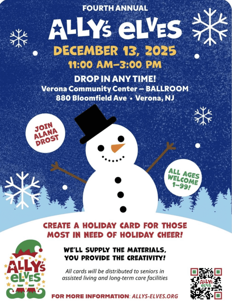 Ally’s Elves is an inclusive community endeavor whose mission is to bring individuals of all ages and abilities together to spread holiday cheer to those most in need. Drop in any time at Verona Community Center to create a holiday card for those most in need of holiday cheer! All ages are welcome.