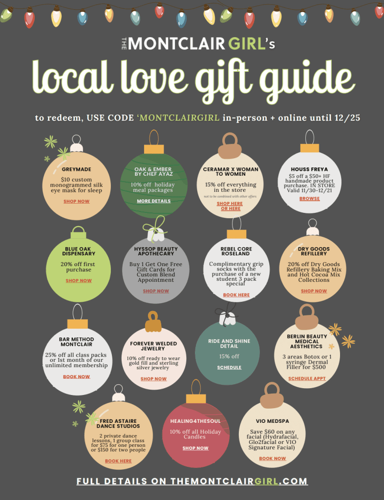 “While it might be early for some, we at The Montclair Girl are all about getting a head-start on holiday gift shopping. Montclair and Northern New Jersey are packed with amazing spots to find fashion, beauty, and food gifts for everyone on your list. We’ve created a holiday shopping guide to introduce our readers to the best small businesses around town—from fitness + dance studios to beauty + self care and everything in between. Plus, some of the spots featured in our downloadable guide are offering special discounts exclusively for MG readers. In addition to the exclusive deals, our guide also includes a comprehensive list of local businesses, broken up by category for easy browsing. And if that’s not enough, we’ve also included some of our editorial articles to help you plan your holiday season — from pop-up markets to Christmas tree shopping.”